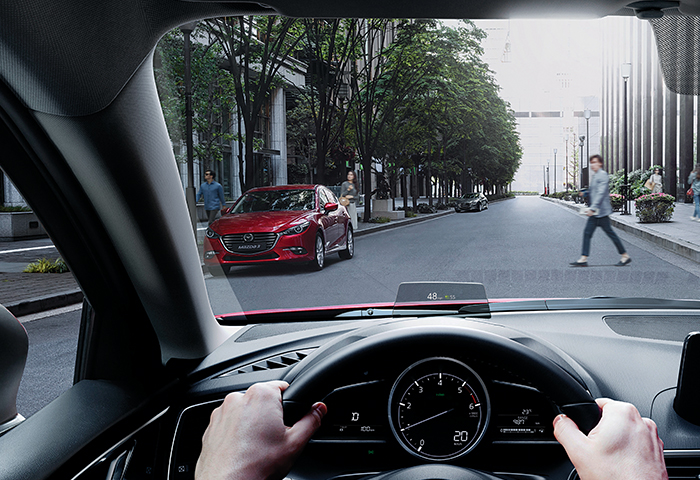 Mazda3 phiên bản cao cấp còn được trang bị màn hình HUD đa sắc hiển thị thông tin trên kính lái, công nghệ LED thích ứng thông minh AFS giúp điều chỉnh góc chiếu sáng khi đánh lái, khẳng định đẳng cấp khi là mẫu xe duy nhất trong phân khúc C được trang bị các tính năng đáng giá thường chỉ xuất hiện trên xe hạng sang.